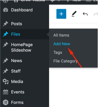 The “Files” plugin can be used to add and organize files on the website. First, create a new file: