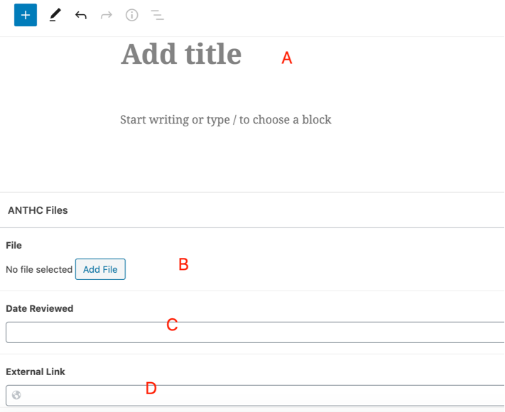• D: If you would like to link to an external file (URL) you can paste it here. No need to upload or attach a file for the entry if you are linking to a document on a different site.