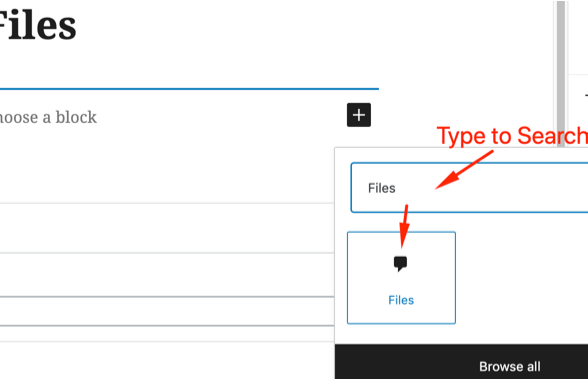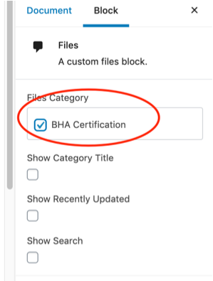 Once you have all of your files added and categorized, you are now ready to add the listing to a page. To do so, you will use the “Files” block type and then just select the category you want to list: