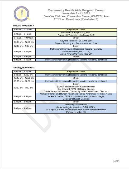 October 25th, 2022 by Kyle von BoseHere is some important information regarding the ANTHC CHAP Forum scheduled for Monday, November 7 through Friday, November 11, 2022. It will be located at the Dena’ina Civic and Convention Center located at 600 West 7th Avenue on the second floor in the Boardroom also known as K’enakatnu 6. Breakfast and lunch will be catered daily. Attached are pictures of the draft agenda, the floor plan showing where the Boardroom is located at the Dena’ina Civic and Convention Center, available parking in downtown Anchorage along with another picture of the parking addresses. If you choose to stay at the Hotel Captain Cook, there are single and double occupancy rooms for $150 per night, refer to Alaska Native Tribal Health Organization for this rate. Valet parking at this hotel is $36 daily or self-park for $30 daily.