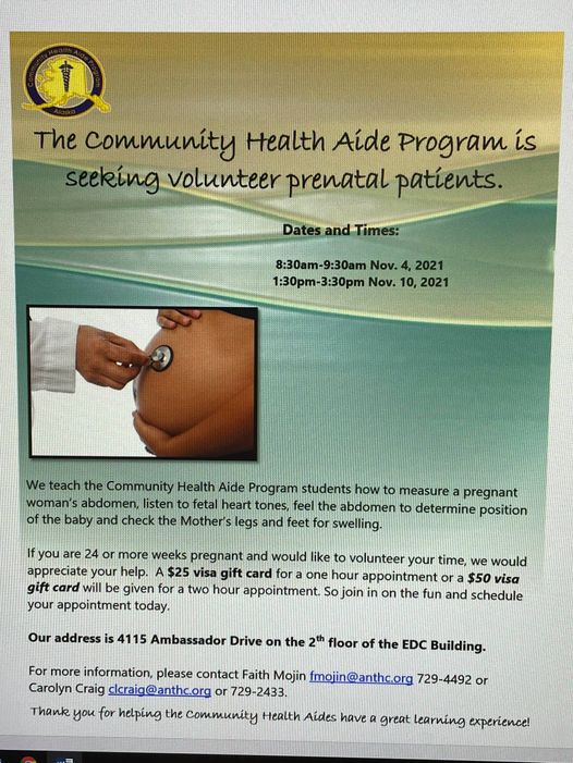 November 1st, 2021 by Kyle von BoseWe need prenatal patient volunteers 24+ weeks pregnant for our health aide students on November 4 and November 10.